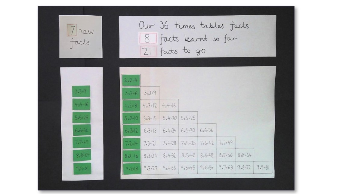 This has been something we have learnt in feedback from schools using our Number Facts Fluency programme, but on reflection shouldn’t really have surprised us. Just as we as teachers found it incredibly useful mapping facts out that we need to teach (yes – it turns out that knowing what it is you are trying to teach is very helpful!) we have also found being explicit about the facts we are learning and where we are in the process of learning them is incredibly supportive to children. We’ve found it’s possible to avoid times tables becoming the insurmountable challenge which they have sometimes felt like to me - and many children I have taught - in the past. Give the children the message “We’re going to learn our times tables. I’ve got a great method we will use. We only have these 36 facts to learn. We’ll learn them a few at a time over a year and a half, and it’s my job to make sure it works for you all.” Then be really explicit as you go about how many facts you have learnt already.