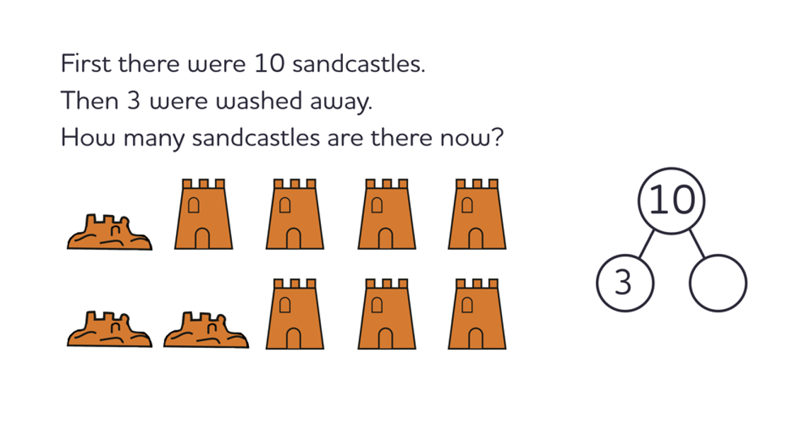 Stage 2 includes a focused study of each number to 10 in turn. Children practice making each number from two smaller numbers (the basis of addition) and practice partitioning each number (the basis of subtraction). These animations are from Make and Break 10, the third teaching step in the stage. The full programme includes similar animations for every number from 1 to 10, so that children can build their confidence manipulating and calculating with one number at a time. Our free membership provides access to story context animations for every number to 10.