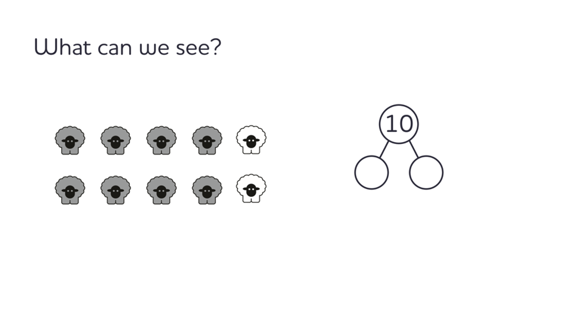 Stage 5 teaches children the calculation strategies which enable them to become fluent in all the addition and subtraction facts across 10. Through the teaching of these strategies, children continue to practice spotting key number relationships and 'using what you know to work out what you don't yet know'. These animations are two of four in the first teaching step which focuses on the 'Make 10 and Then' strategy for addition.
